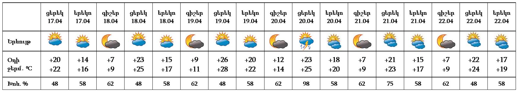 Երևան քաղաքում ապրիլի 17-ի ցերեկը, 18-19-ին սպասվում է առանց տեղումների եղանակ: Ապրիլի 20-ին սպասվում է կարճատև անձրև և ամպրոպ, քամու ուժգնացում՝ 14-17մ/վրկ արագությամբ: