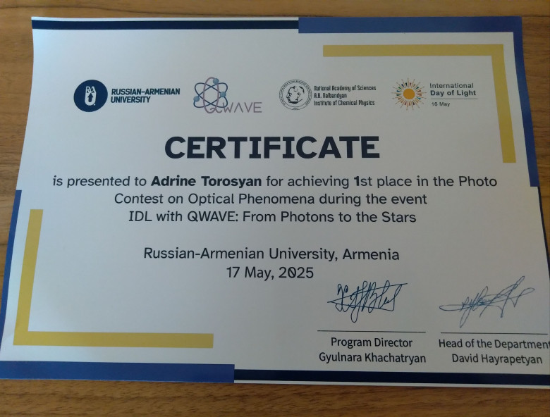 Հերթական 1-ին պատվավոր մրցանակը՝ այս անգամ էլ գիտական լուսանկարների մրցույթում․ Ադրինե Թորոսյան