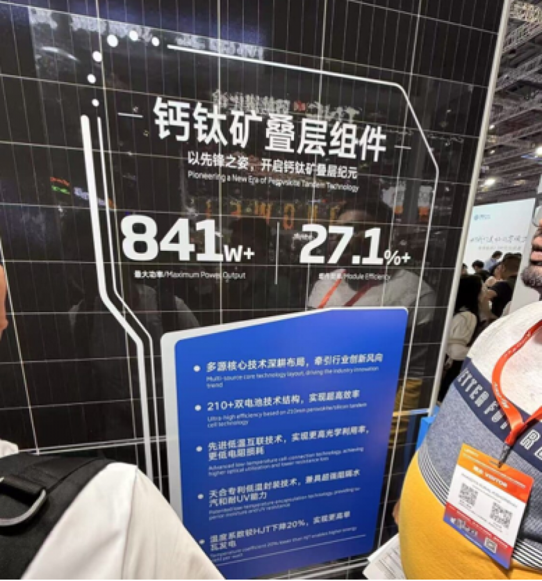 ՀասարակությունՉինական Trina Solar ընկերությունը ներկայացրել է 841 Վտ հզորությամբ պերովսկիտ-սիլիցիումային տանդեմային արևային մոդուլի նախատիպը, գրում է prosolar.ru–ն։ Ընկերությունը Չինաստանի Շանհայում կայացած SNEC միջազգային ֆոտովոլտային և խելացի էներգիայի ցուցահանդեսում է ներկայացրել այդ նախատիպը։ Վահանակն ունի 27.1 % ընդհանուր մոդուլային արդյունավետություն և հիմնված է 210 մմ տանդեմային բջիջների վրա։ Trina-ն հայտարարել է, որ օգտագործել է ցածր ջերմաստիճանի միացման տեխնոլոգիա ավելի բարձր օպտիկական օգտագործման և ավելի ցածր դիմադրության կորուստների հասնելու համար։