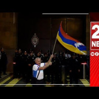 Ցուցարարները ոստիկանական շենքի առաջ ծածանում են Արցախի դրոշը
