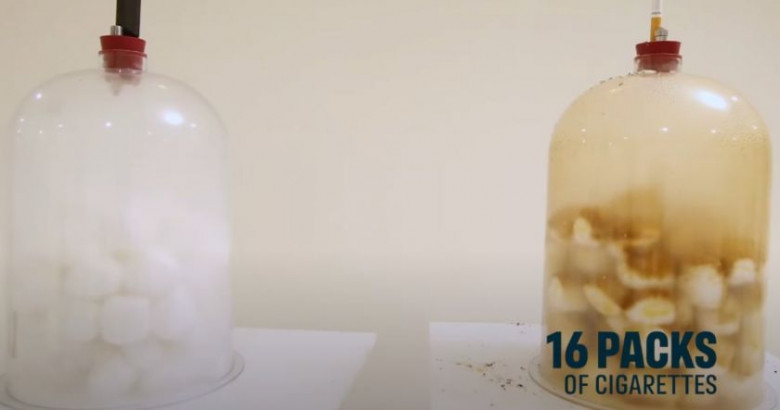 Առաջին տարայի դեպքում օգտագործվել է 16 տուփ սիգարետ. Գործընթացի ավարտից հետո տարայում տեղադրված բամբակի, ինչպես նաև դրան միացված խողովակների ուսումնասիրության արդյունքում պարզ դարձավ, որ ծխելու հետևանքով թոքերում կուտակվում է աննախադեպ քանակությամբ խեժ: Այնուհետև, ուսումնասիրվեց էլեկտրոնային սիգարետի տարան. ընդամենը մի քիչ գոլորշի, մի քիչ խոնավություն, և վերջ: