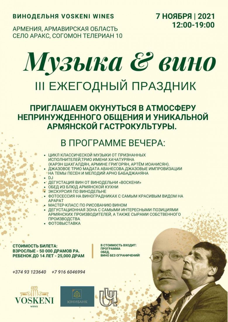 ՀասարակությունՆոյեմբերի 7-ին Հայաստանում երրորդ անգամ Voskeni Wines գինեգործարանում կկայանա «Երաժշտության և գինու» ամենամյա տոնակատարությունը: Այս անգամ միջոցառումը նվիրված է երկու մեծագույն կոմպոզիտորների՝ Ալ. Սպենդիարյանի՝ 150, և Առնո Բաբաջանյանի՝ 100-ամյակներին: