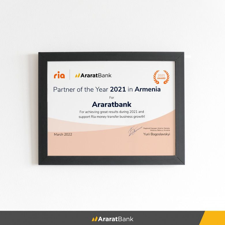 ԱրարատԲանկը ճանաչվել է Ria Money Transfer–ի «Տարվա գործընկեր»
