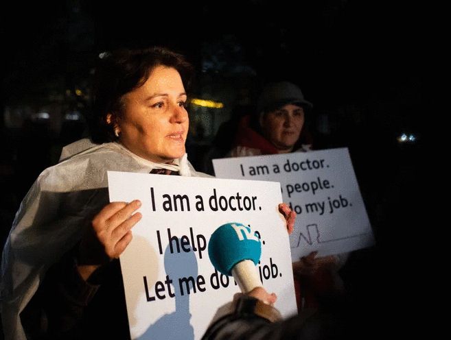 Երկրի տարբեր շրջաններից եկած՝ սպիտակ արտահագուստով տասնյակ բժիշկներ հորդորեցին ՄԱԿ-ին և միջազգային հանրությանը անհապաղ միջամտել և օգնել՝ տարածաշրջանում հումանիտար աղետից խուսափելու համար։ Բժիշկները դուրս էին եկել «Բժիշկների համար սահմաններ չկան», «Պահանջում եմ թույլ տալ՝ տեսնել իմ հիվանդներին», «Օգնեք մեզ փրկել նրանց» և այլ կարգախոսներով։