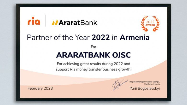 ՀասարակությունRia Money Transfer համակարգն ԱրարատԲանկին հերթական անգամ արժանացրել է 2022թ․ «Տարվա գործընկեր» մրցանակին։