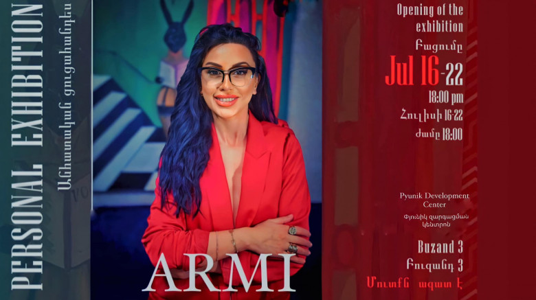 ՀասարակությունՀուլիսի 16-22-ը՝ Փյունիկ ցուցասրահում (Բուզանդ 3) տեղի կունենա նկարչուհի Արմի Հարությունյանի անհատական ցուցահանդեսը։ Մուտքն ազատ է։