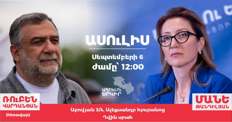 «Ապրելու երկիր» կուսակցության նախագահ Մանե Թանդիլյանը և հասարակական-քաղաքական գործիչ, «Արցախի անվտանգության և զարգացման ճակատ» հանրային շարժման համակարգող Ռուբեն Վարդանյանը(հեռավար) հանդես կգան համատեղ մամուլի ասուլիսով։Թեման՝ Երևանի ավագանու ընտրություններ։
