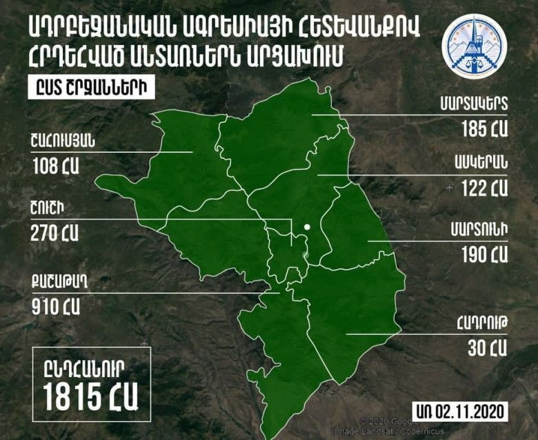 Արցախի Մարդու իրավունքների պաշտպանի փաստահավաք առաքելության շրջանակներում պարզվել է, որ ադրբեջանական կողմից Արցախի անտառների դիտավորյալ հրդեհումը կրում է համատարած բնույթ և ընդգրկում է բոլոր շրջանները: Նախնական տեղեկություններով՝ հրդեհի է մատնվել արդեն 1815 հեկտար անտառածածկ տարածք, սակայն տարբեր վայրերում հրդեհները շարունակվում են, և առկա է ծավալների արագ աճի միտում: