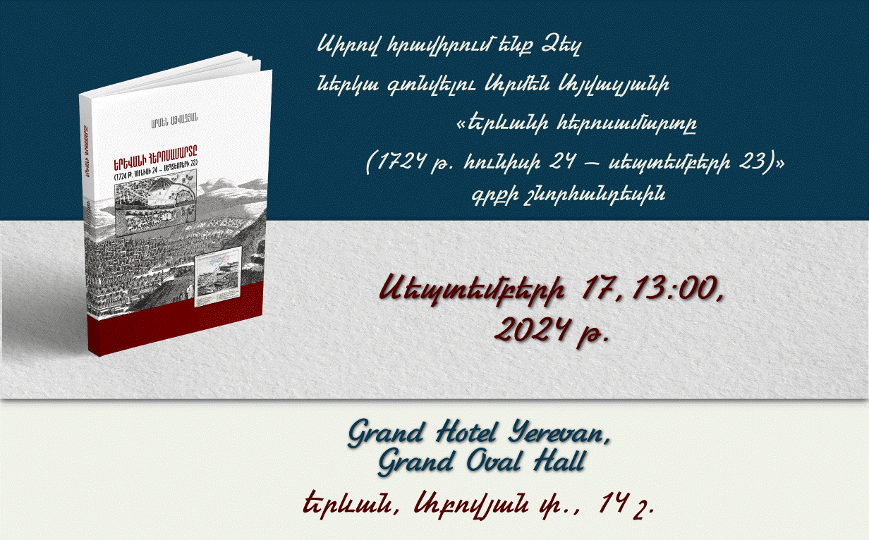 Հենց այս օրերին լրանում է օսմանյան զորքերի դեմ Երևանի պաշտպանության 300-ամյակը։ Այդ կապակցությամբ պատմաբան և քաղաքագիտության դոկտոր Արմեն Այվազյանը պատրաստել է «Երևանի հերոսամարտը (1724 թ. հունիսի 24 — սեպտեմբերի 23)» մենագրությունը, որի շնորհանդեսը կայանալու է ս.թ. սեպտեմբերի 17-ին̀ ժամը 13:00-ին, «Գրանդ հոթել Երևան»-ի Օվալային մեծ սրահում։ Սիրով հրավիրում ենք մասնակցելու այդ միջոցառմանը։