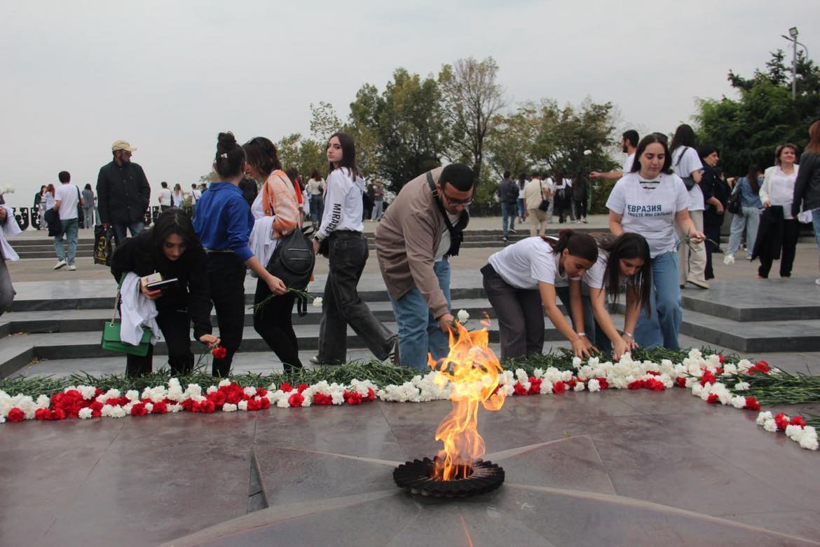 Ֆլեշմոբի ավարտին մասնակիցները ծաղիկներ խոնարհեցին «Անմար կրակի» հուշահամալիրի առջև: