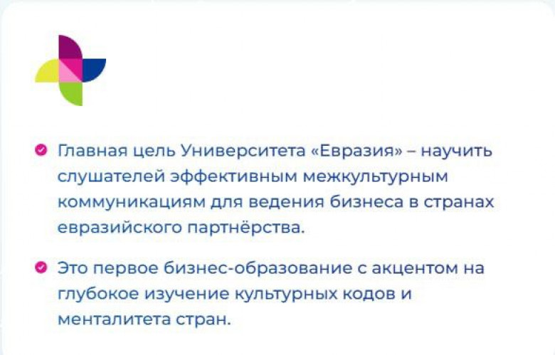 «Եվրասիա» համալսարանը առաջարկում է բիզնես կրթության նոր ձևաչափ, որը միտված է տարբեր երկրների մշակույթի, ավանդույթների և գործնական հաղորդակցության առանձնահատկությունների ուսումնասիրությանը: