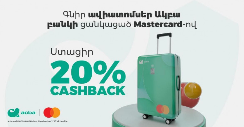 Ակբա բանկի Mastercard քարտապանները մինչև դեկտեմբերի 25-ը ներառյալ հնարավորություն ունեն գնել ավիատոմս և միանվագ ստանալ մինչև 20% քեշբեք՝ առավելագույնը 20 000 ՀՀ դրամ սահմանաչափով։