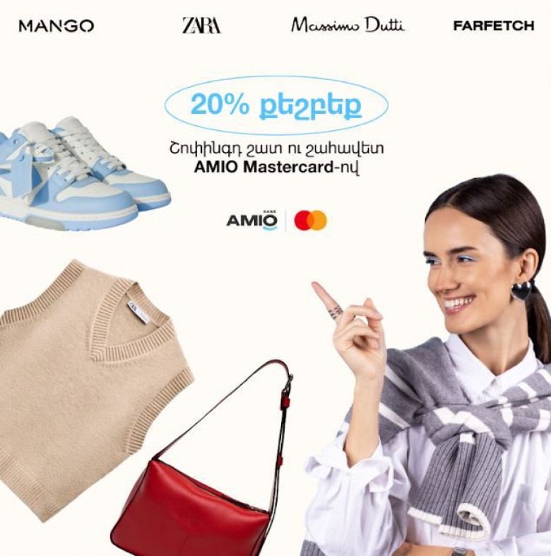 Ամիօ բանկը Mastercard-ի հետ մեկնարկել է բացառիկ ակցիա շոփինգի սիրահարների համար։ Մինչև 15.01.2025-ը ներառյալ, կատարելով գնումներ Zara, Mango, Massimo Dutti և Farfetch խանութներից՝ Ամիօ բանկի Mastercard Digital, Gold, Platinum և World Elite տեսակի քարտերով, կստանաք 20% քեշբեք։ Հայաստանից կարող եք գնումներ կատարել օնլայն տարբերակով, իսկ արտերկրում և՛ օնլայն տարբերակով, և՛ նշված խանութներից:
