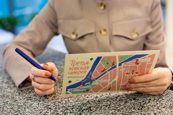 Հիշատակի բացիկը ստեղծվել է նկարազարդող Աննա Վասիլևայի կողմից, որը հայտնի է մանկական գրքերի և թատրոնի աֆիշաների համար իր աշխատանքներով, ինչպես նաև իր թեթև ու ինքնաբուխ նկարչական ոճով։ 2021թ․-ին նա ընդգրկվել է World Illustration Awards ամենահեղինակավոր միջազգային մրցանակի կարճ ցուցակում (shortlist)։ Հաշվի առնելով, որ Տրետյակովյան պատկերասրահը մայրաքաղաքում ունի շենքերի և մասնաճյուղերի բավականին ընդարձակ աշխարհագրություն՝ բացիկի սյուժեն ստացվել է ինքնին․ ցույց է տալիս նոր մասնաշենքի գտնվելու վայրը Մոսկվայի քարտեզի վրա՝ մնացած բոլոր մասնաճյուղերի նկատմամբ, իսկ ավելի կոնկրետ՝ Յակիմանկա թաղամասը, որտեղ կենտրոնացած է շենքերի մեծ մասը: Այսպիսով, նոր մասնաշենքում առաջին ցուցահանդեսի այցելուներին մնաց հուշանվեր՝ հիշեցնող ոչ միայն խորհրդանշական ցուցահանդես, այլև թանգարանի նոր մասնաշենք նրանց այցելության մասին, որի բացումը գրեթե 20 տարվա շինարարությունից հետո դարձավ պատմական իրադարձություն Ռուսաստանի մշակութային կյանքում.