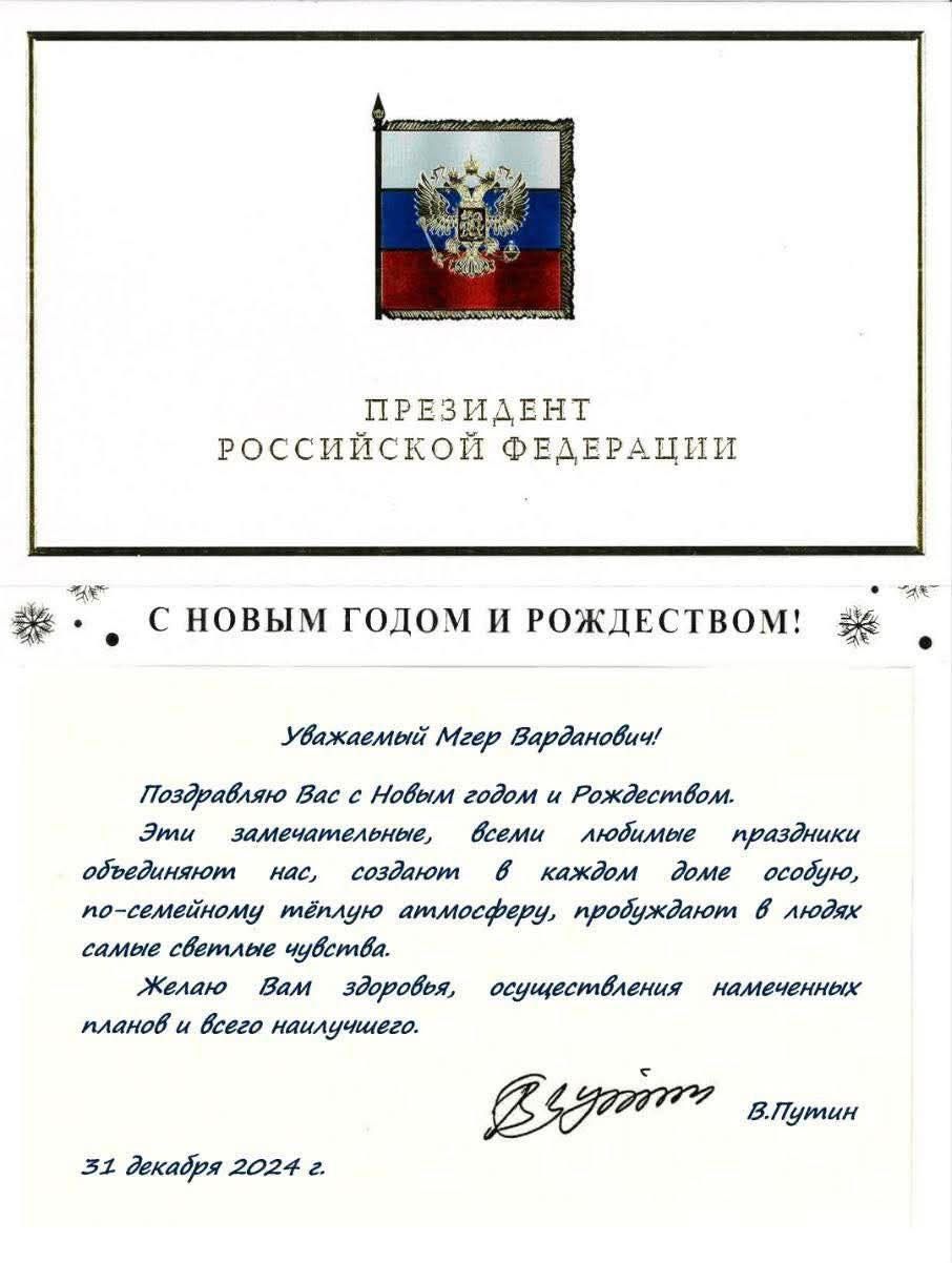 ՌԴ նախագահ Վլադիմիր Պուտինը շնորհավորել է «Անմահ գունդ» միջազգային շարժման գլխավոր համակարգող, հասարակական գործիչ Մհեր Ավետիսյանին Նոր տարվա առթիվ։