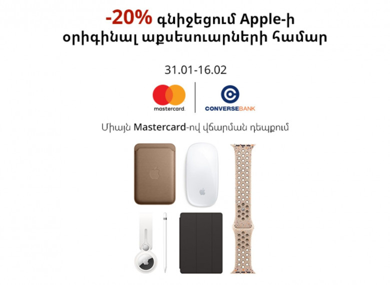Կոնվերս Բանկն իր Mastercard քարտապաններին առաջարկում է միանալ Mastercard միջազգային վճարահաշվարկային համակարգի և Apple ապրանքանիշի համատեղ արշավին, 31.01.25 - 16.02.25թթ. գնել Apple գաջեթներ կամ աքսեսուար iSpace, Vega, Team Armenia, UCOM, VLV, iStore խանութներից և ստանալ.