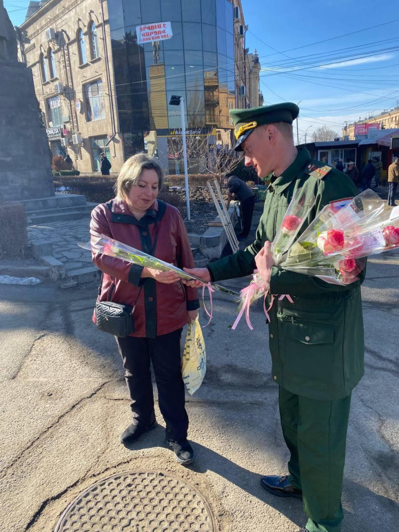 Այսօր ռազմաբազայի սպաները Գյումրիի փողոցներում Հայաստանի գեղեցիկ սեռի ներկայացուցիչներին ծաղիկներ են նվիրել։