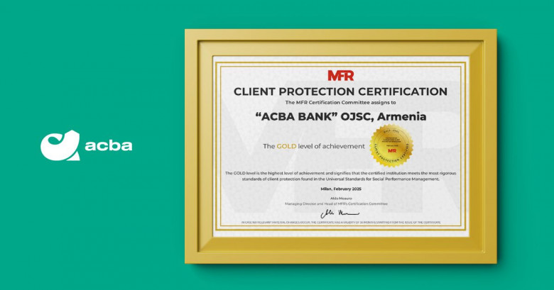 Ակբա բանկը միջազգային հեղինակավոր MFR գործակալության կողմից արժանացել է «Հաճախորդների պաշտպանության հավաստագրման» (Customer protection certification) ամենաբարձր՝ ոսկե մակարդակի։