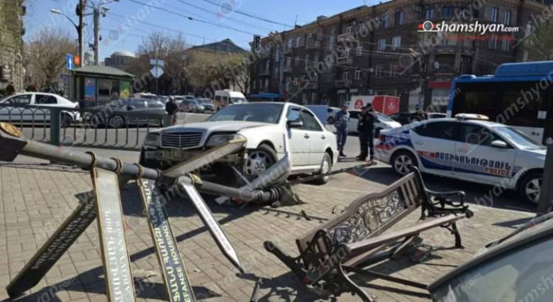 Բախման հետևանաքով «Mercedes»-ը դուրս է եկել երթևեկելի գոտուց, կոտրել մայթեզրին տեղադրված երկաթե ճաղավանդակները, ապա ցուցանակը և հայտնվել մայթին: