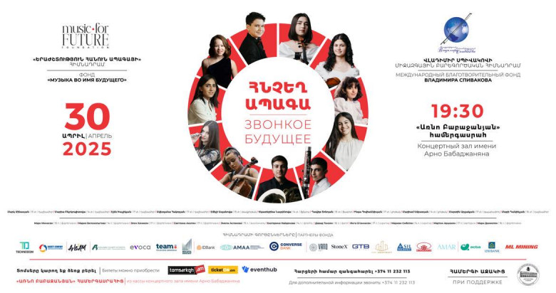 ՀասարակությունԱպրիլի 30-ին՝ ժամը 19։30-ին, «Առնո Բաբաջանյան» համերգասրահում տեղի կունենա «Հնչեղ ապագա» խորագրով համերգը՝ «Երաժշտություն հանուն ապագայի» հիմնադրամի և Վլադիմիր Սպիվակովի միջազգային բարեգործական հիմնադրամի կրթաթոշակառուների մասնակցությամբ: Համերգը կազմակերպվում է «Մոսկվայի տուն» մշակութային գործարար կենտրոնի աջակցությամբ։ Իսկ տոմսերի վաճառքից ստացված ողջ հասույթը կուղղվի «Երաժշտություն հանուն ապագայի» հիմնադրամի տաղանդավոր երաժիշտների համար իրականացվող կրթական ծրագրերին: Այս համերգը ևս մեկ կարևոր քայլ է մասնագիտական բարձունքների ձգտող երիտասարդ երաժիշտների ստեղծագործական զարգացման և մշակութային փոխանակման ուղղությամբ։