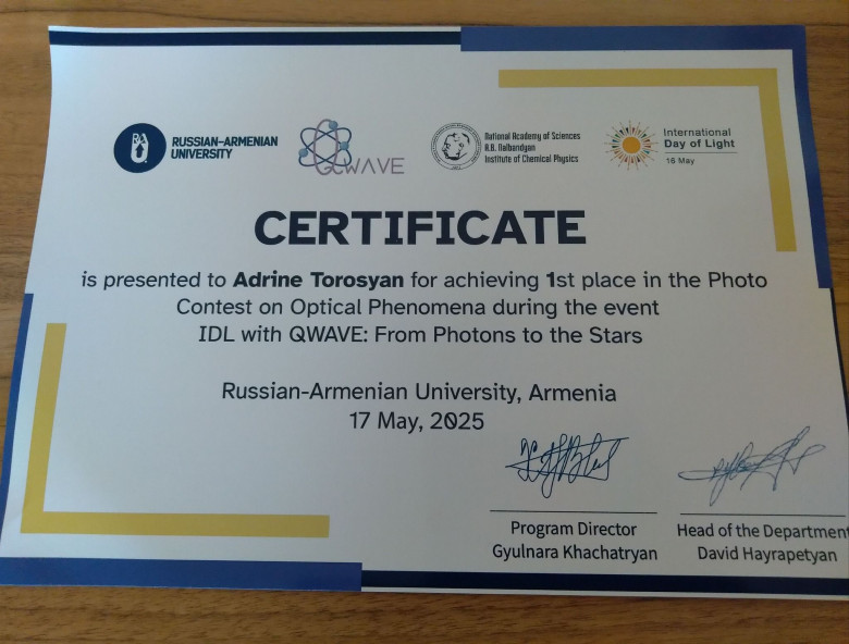 ՀասարակությունԱդրինե Թորոսյանի հերթական 1-ին պատվավոր մրցանակը՝ այս անգամ էլ գիտական լուսանկարների մրցույթում. ֆիզիկայի փայլուն գիտելիքներս համադրվեցին լուսանկարչի, հեռուստառեժիսորի մասնագիտական կարողություններիս հետ: