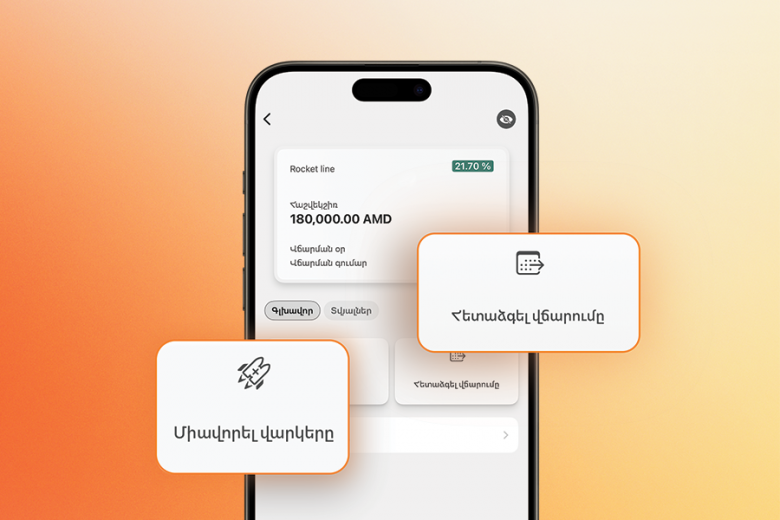 Դե, իսկ Rocket Line-ի միավորումը իրենից ենթադրում է ընտրված վարկերի մնացորդային պարտքի չափով նոր Rocket Line վարկի տրամադրում և ընտրված վարկերի ավտոմատ մարում։ Նոր վարկը կրկին կպատկերվի հավելվածի Բանկինգ բաժնի Rocket Line վարկեր բաժնում՝ Rocket Line (միավորված) անվանմամբ։
