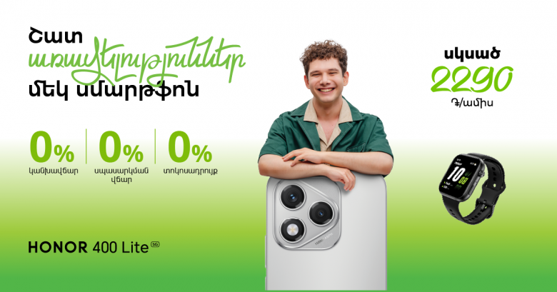 Միայն Ucom-ում՝ հատուկ առաջարկի շրջանակներում, HONOR 400 Lite 5G սմարթֆոնի գնորդները կստանան HONOR Choice 2i բրենդային խելացի ժամացույց և 2 ամիս անվճար Level Up+ 3000 փաթեթով գեղեցիկ հեռախոսահամար՝ ամսական սկսած ընդամենը 2290 դրամից։ Սմարթֆոնը հնարավոր է ձեռք բերել ինչպես կանխիկ՝ 109 900 դրամով, այնպես էլ ապառիկի հատուկ պայմաններով՝ առաջին 8 ամսվա համար 0 տոկոս կանխավճարով, 0 տոկոս սպասարկման վճարով և 0 տոկոս տոկոսադրույքով։