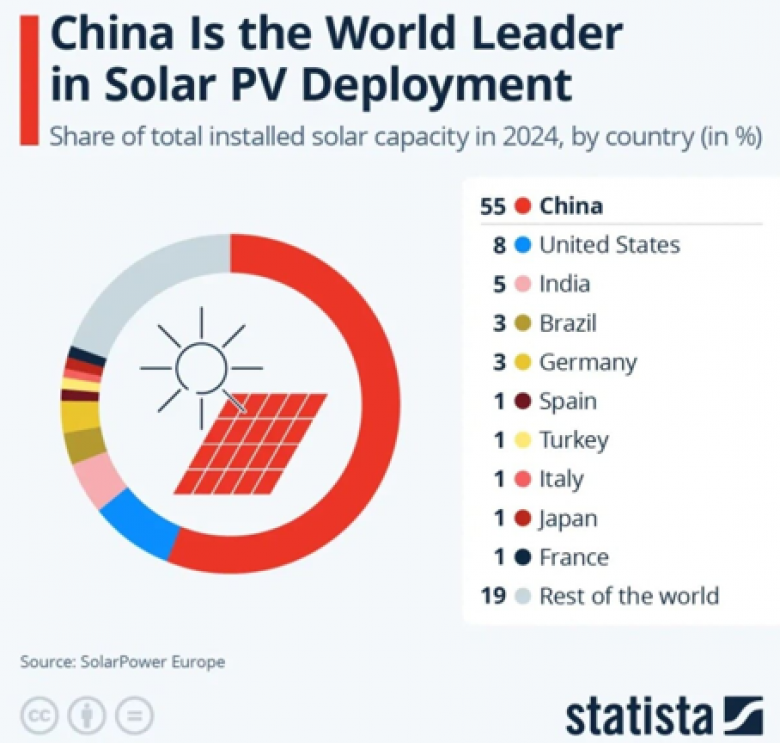 Carbon Brief-ի տվյալներով՝ Չինաստանը 2025 թվականին կտեղադրի ավելի շատ արևային էլեկտրակայաններ (գիգավատներով), քան արտահանել է։ Համաշխարհային տեղադրված արևային հզորությունը 2024 թվականին հասել է ռեկորդային 597 գիգավատի, նախորդ տարի ավելացված 148 գիգավատից հետո։ Այսպիսով, Ասիա-խաղաղօվկիանոսյան տարածաշրջանը պահպանել է իր առաջատար դիրքը՝ կազմելով համաշխարհային հզորությունների ավելացման 70%-ը։