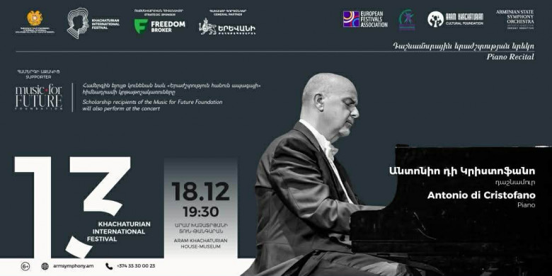 ՀասարակությունԴեկտեմբերի 18-ին Արամ Խաչատրյանի անվան 13-րդ միջազգային փառատոնի շրջանակում Արամ Խաչատրյանի տուն-թանգարանում տեղի կունենա իտալացի դաշնակահար Անտոնիո դի Կրիստոֆանոյի մենահամերգը, որի աջակիցն է «Երաժշտություն հանուն ապագայի» հիմնադրամը: Համերգին իր ելույթներով հանդես կգան նաև «Երաժշտություն հանուն ապագայի» հիմնադրամի կրթաթոշակառուները։ Երեկոյի ընթացքում կհնչեն Ռոբերտ Շումանի Արաբեսկ դո մաժոր, երկ 18 (6 րոպե), Յոհաննես Բրամսի 4 Բալլադ, երկ 10 (22 րոպե), Ֆերենց Լիստի «Օբերմանի հովիտը» թիվ 6 մի մինոր «Ուխտագնացության տարիներ» սյուիտներից, S. 160 (14 րոպե), Ալբան Բերգի Դաշնամուրի սոնատ, երկ 1 (10 րոպե), Ֆրեդերիկ Շոպենի Պոլոնեզ թիվ 7 լյա բեմոլ մաժոր, երկ 61, «Պոլոնեզ-ֆանտազիա» (14 րոպե) ստեղծագործությունները։
