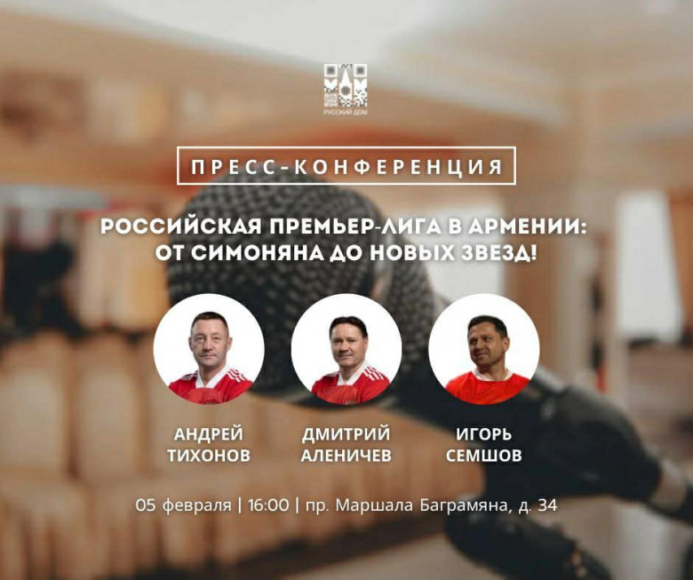 ՔաղաքականությունՓետրվարի 3-ից 6-ը, «Ռոսսոտրուդնիչեստվոյի» և Երևանի Ռուսական տան աջակցությամբ Ռուսաստանի ֆուտբոլային միության և Պրեմիեր լիգայի ներկայացուցիչները կլինեն Երևանում: Այդ ժամանակահատվածում նախատեսվում է Ռուսաստանի և Հայաստանի միջև սպորտային համագործակցության զարգացմանն ուղղված մի շարք միջոցառումներ անցկացնել: Ռուսաստանյան պատվիրակության կազմում են ռուսական ֆուտբոլի լեգենդներ Անդրեյ Տիխոնովը, Դմիտրի Ալենիչևը և Իգոր Սեմշովը, ինչպես նաև ՌՖՄ և ՌՊԼ այլ ներկայացուցիչներ: