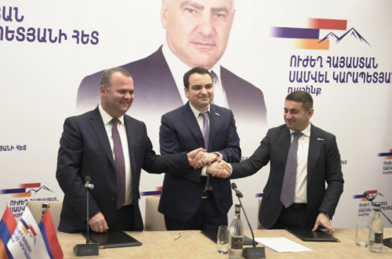 Օրերս «Ուժեղ Հայաստան» կուսակցության խորհրդի անդամ Նարեկ Կարապետյանը դաշինքի ստեղծման վերաբերյալ հուշագիր էր ստորագրել «Նոր դարաշրջան» կուսակցության նախագահ Հարություն Հարությունյանի և «Միավորված հայեր» կուսակցության պատվավոր նախագահ, լիազոր ներկայացուցիչ Նաիրի Սարգսյանի հետ։ Դաշինքը կկոչվի «Ուժեղ Հայաստան Սամվել Կարապետյանի հետ»: