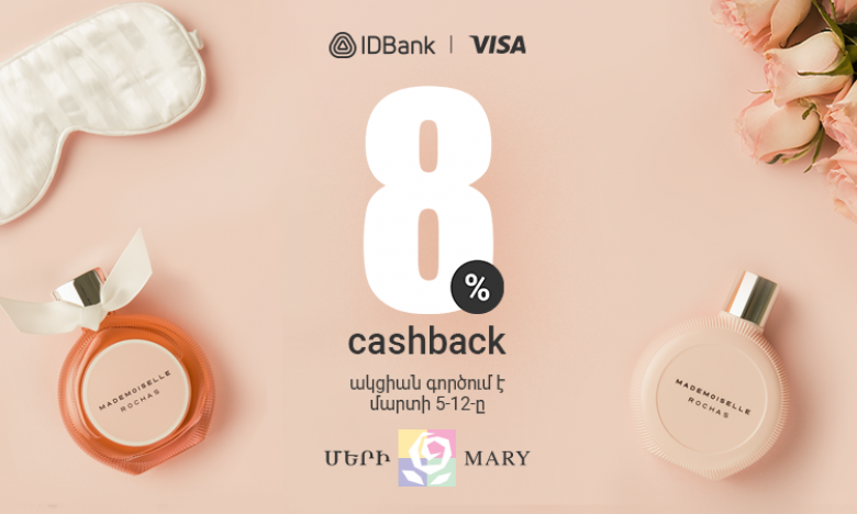 ՀասարակությունԿանանց տոների առթիվ մարտի 5-ից 12-ը ներառյալ «Մերի» օծանելիքի խանութ-սրահների ցանցից գնումներ կատարելիս վճարե՛ք IDBank-ի Visa քարտերովև ստացե՛ք 8% քեշբեք` գումարի վերադարձ։