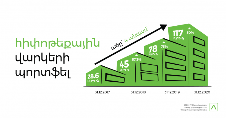 Ամերիաբանկի հիփոթեքային պորտֆելը 2020թ.–ին աճել է 50%–ով` տարեվերջի դրությամբ կազմելով շուրջ 117 մլրդ դրամ